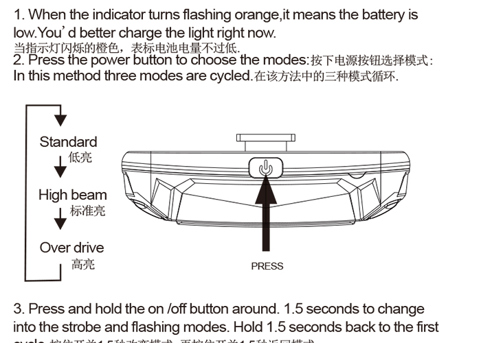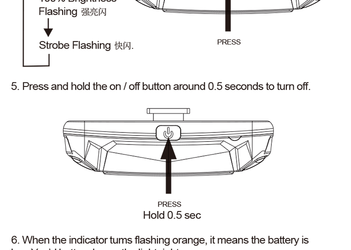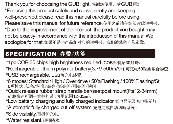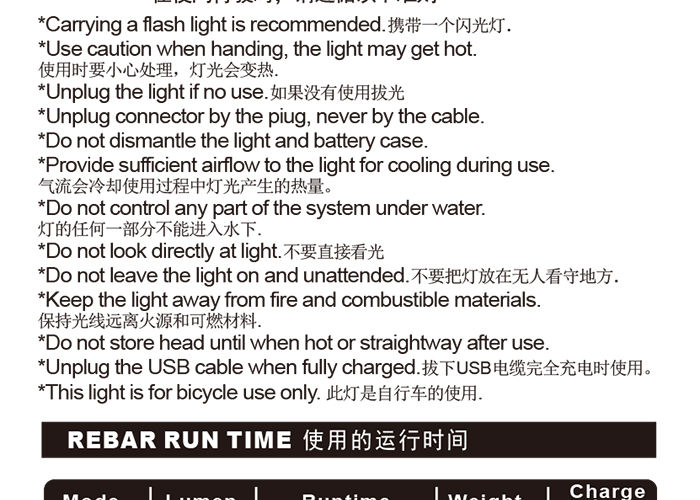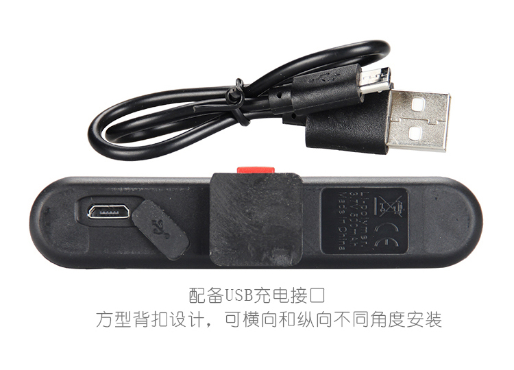 特性:LED技術(shù),COB整面發(fā)光30顆燈珠,高亮100流明設(shè)計(jì);配備USB接口,可循環(huán)充電;六種模式可循環(huán)切換;電池自動(dòng)保護(hù)功能,電壓低于2.8V不工作;硅膠捆扎固定方式,120度方位調(diào)整,方便拆卸安裝;方型背扣設(shè)計(jì),可橫向和縱向不同角度安裝;可安裝在坐管,下叉,車把手,前叉等。