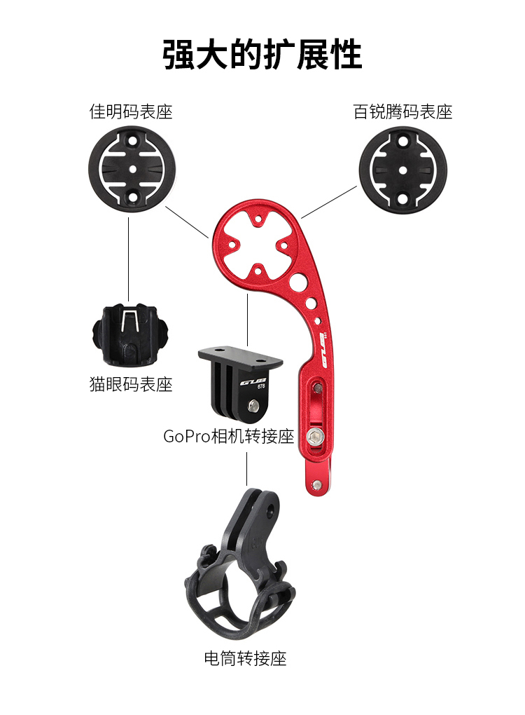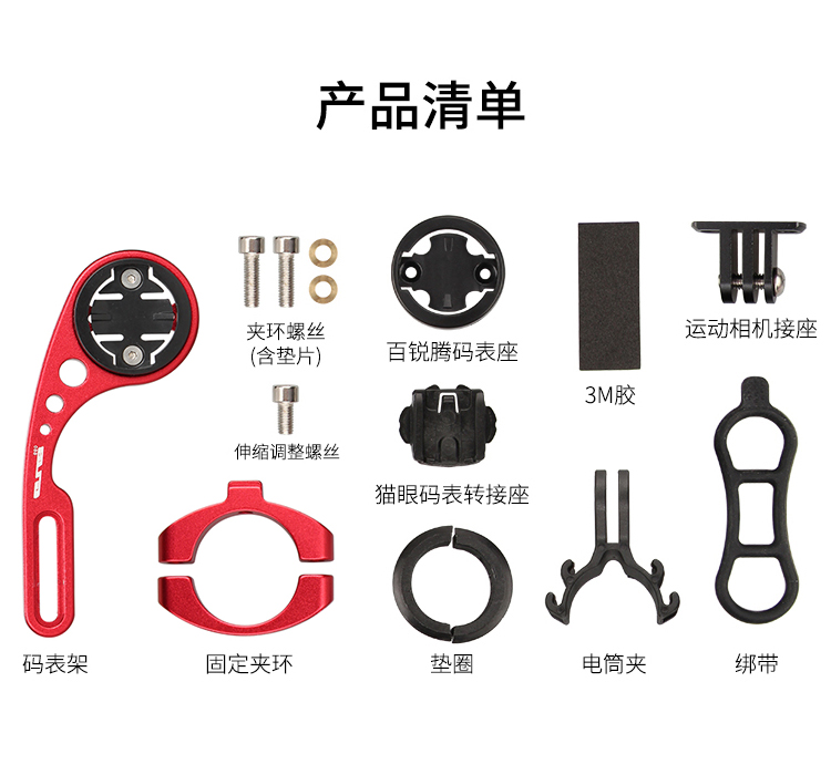 安裝在車把上,可伸縮設(shè)計(jì),兼容佳明碼表,使用附帶的配件可兼容百銳騰碼表、貓眼碼表,另標(biāo)配運(yùn)動相機(jī)轉(zhuǎn)接頭和電筒轉(zhuǎn)接頭。