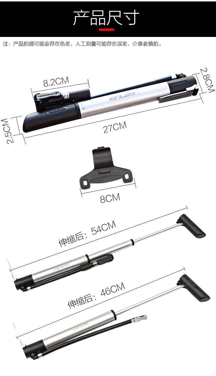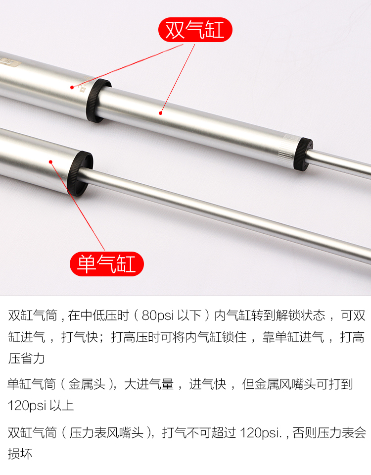 特點:鋁合金氣缸,體積小不占地方,美嘴法嘴兼用,帶固定支架可安裝在車架上