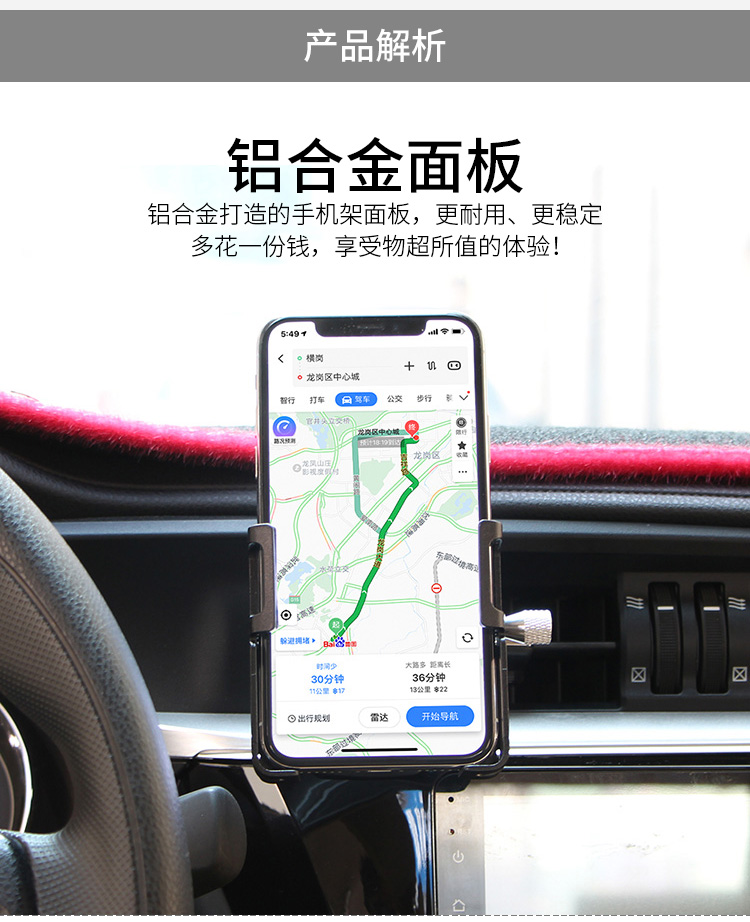 特點(diǎn):鋁合金架體+PC固定組件,55-100mm寬度的手機(jī)均可使用,萬向球+可旋轉(zhuǎn)夾口讓使用更加隨心所欲!