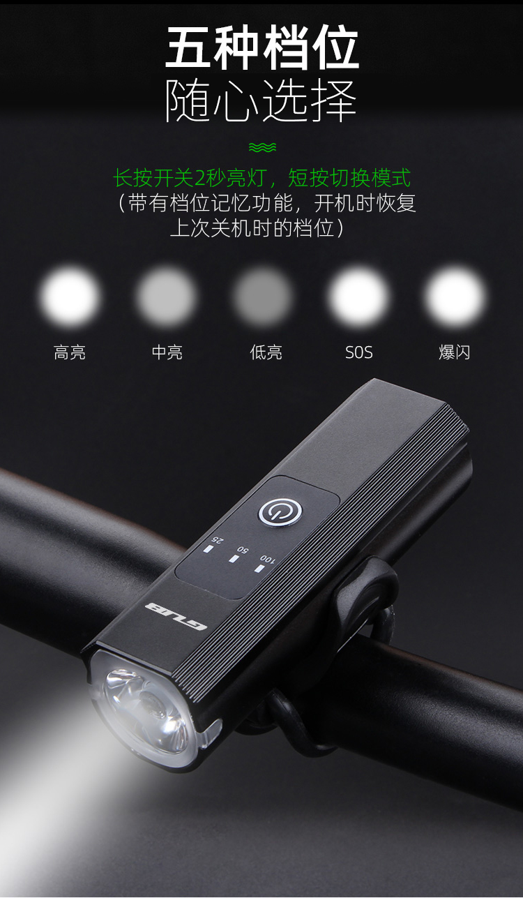 燈光模式:低亮/中亮/高亮/閃亮/SOS
