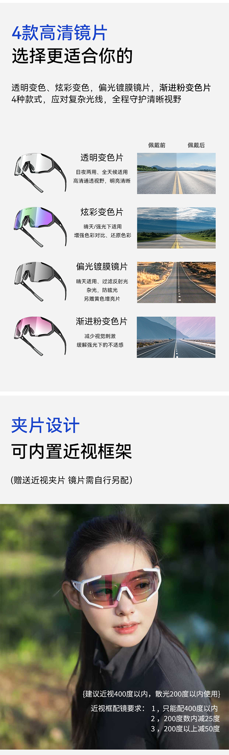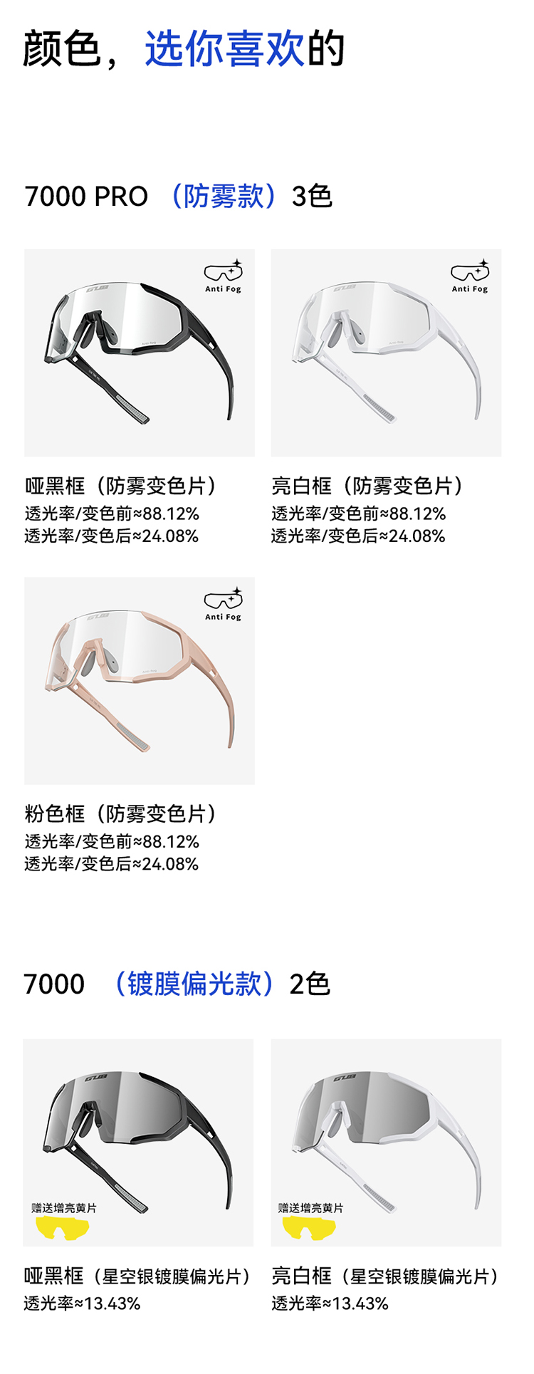 顏色:?jiǎn)『?透明變色片、亮白/透明變色片、櫻花粉/透明變色片、消光灰銀/透明變色片、透砂白/透明變色片、水晶灰/透明變色片、啞黑/星空銀偏光片、亮白/星空銀偏光片、亮白/漸進(jìn)粉變色片、亮白/漸進(jìn)藍(lán)變色片、啞黑/漸進(jìn)粉變色片