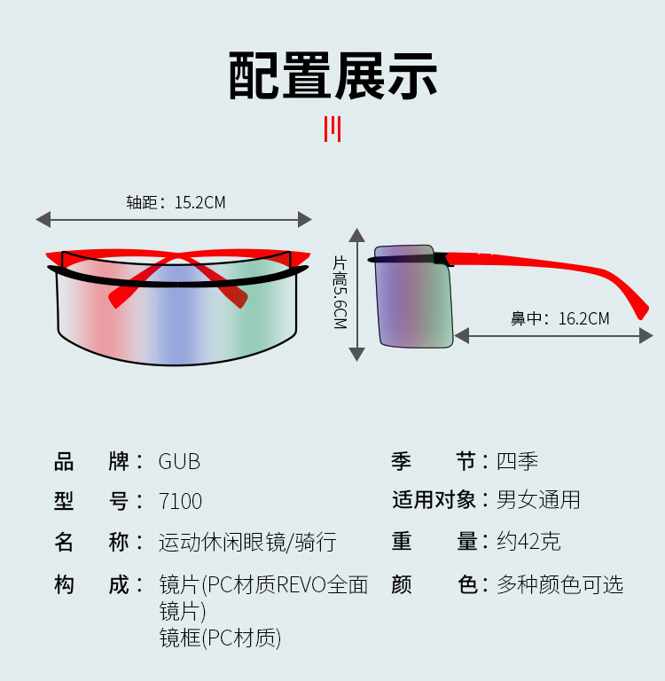 顏色:黑砂紅/紅鏡片、黑砂紅/白冰藍(lán)鏡片、黑砂紅/粉紫鏡片、黑砂紅/綠鏡片