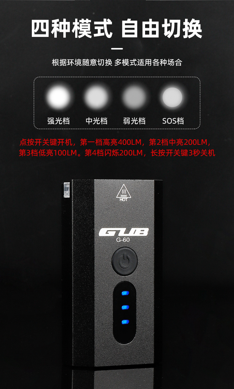 燈光模式:高亮/中亮/低亮/SOS