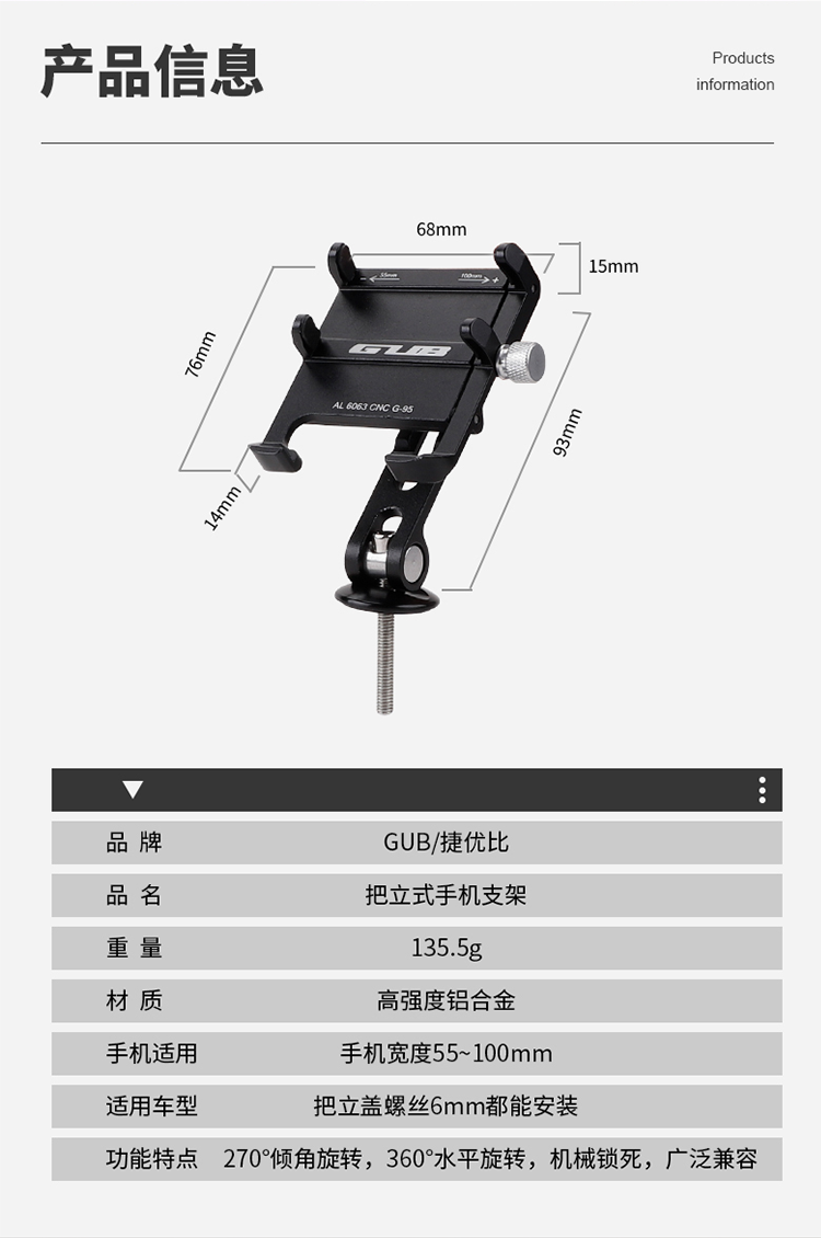 名稱:GUB G-95 旋轉(zhuǎn)款鋁合金手機(jī)支架(碗組蓋固定)