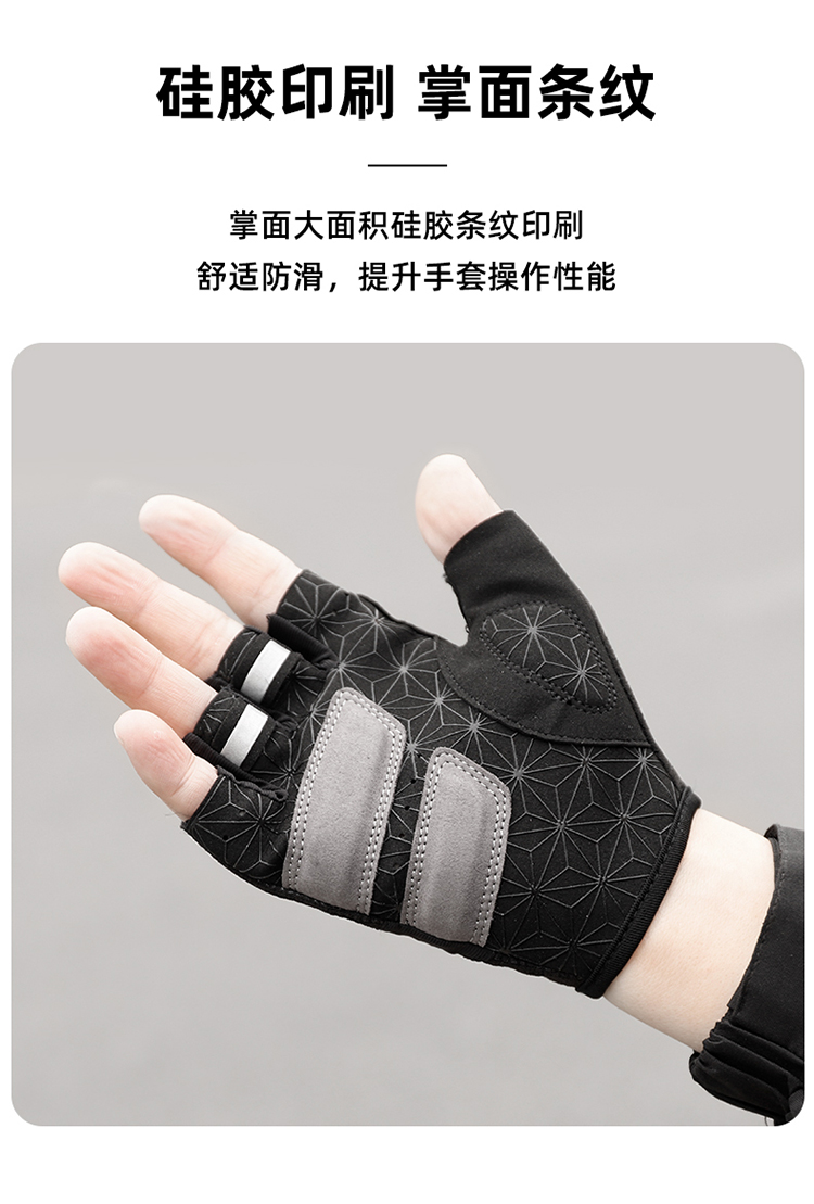 特點(diǎn):簡約設(shè)計(jì)、貼合手掌,手背高彈透氣面料,手掌大面積硅膠印刷條紋,防滑效果好