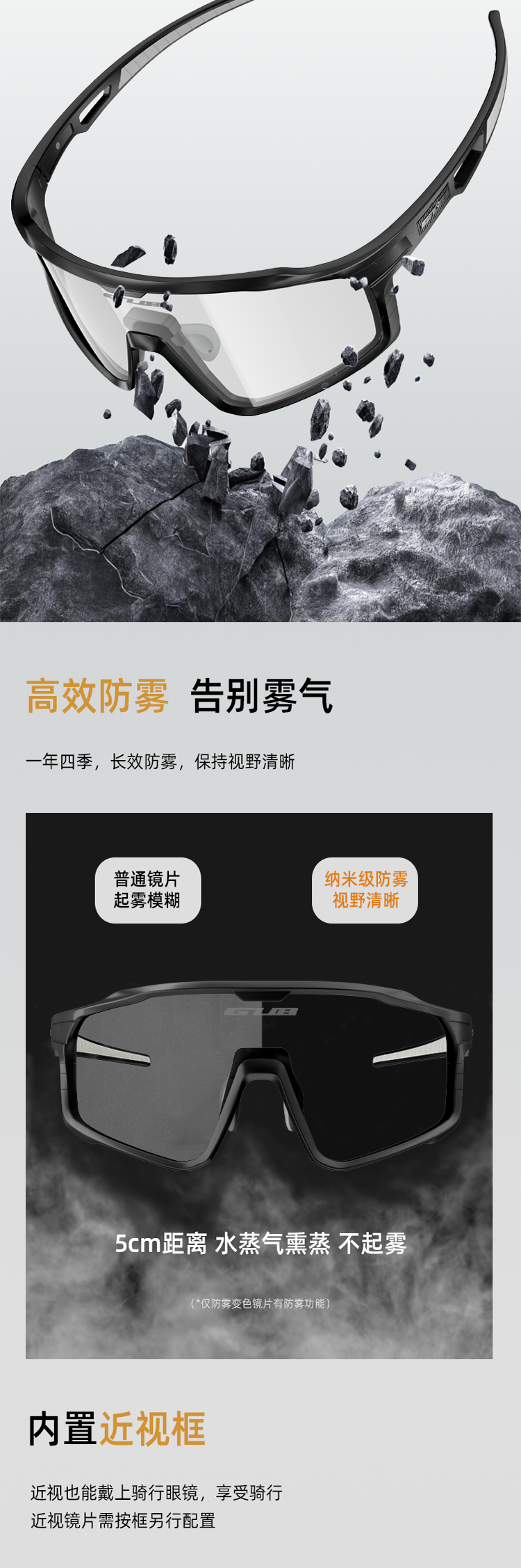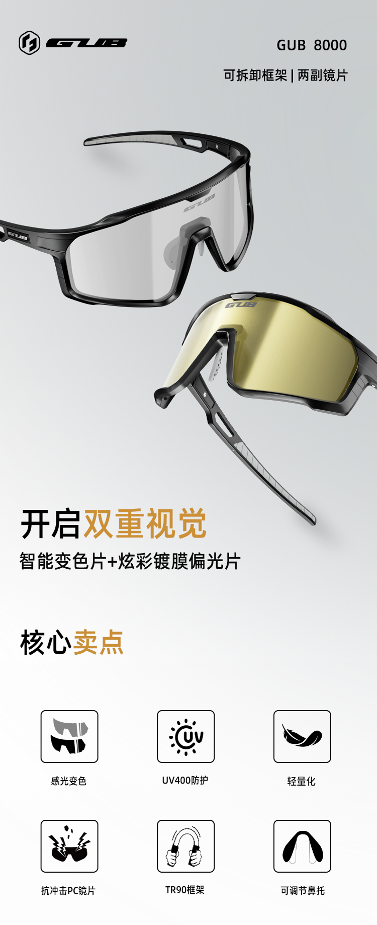 特點:標配透明變色片,另贈送一副偏光鏡片和下框,一副眼鏡,四種顏色搭配,滿足個性需求。專利設計上下可拆卸框,快速更換鏡片。