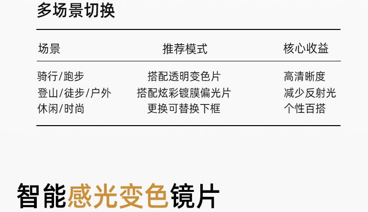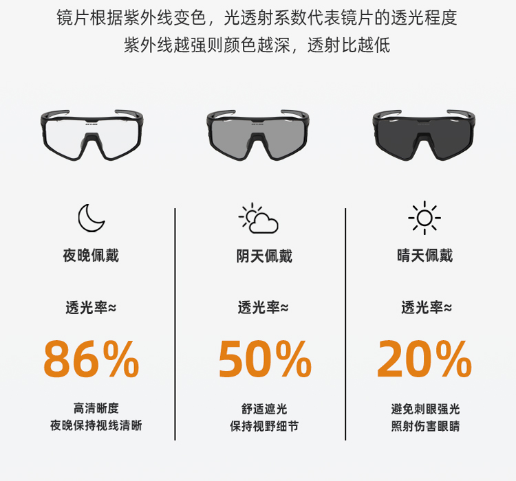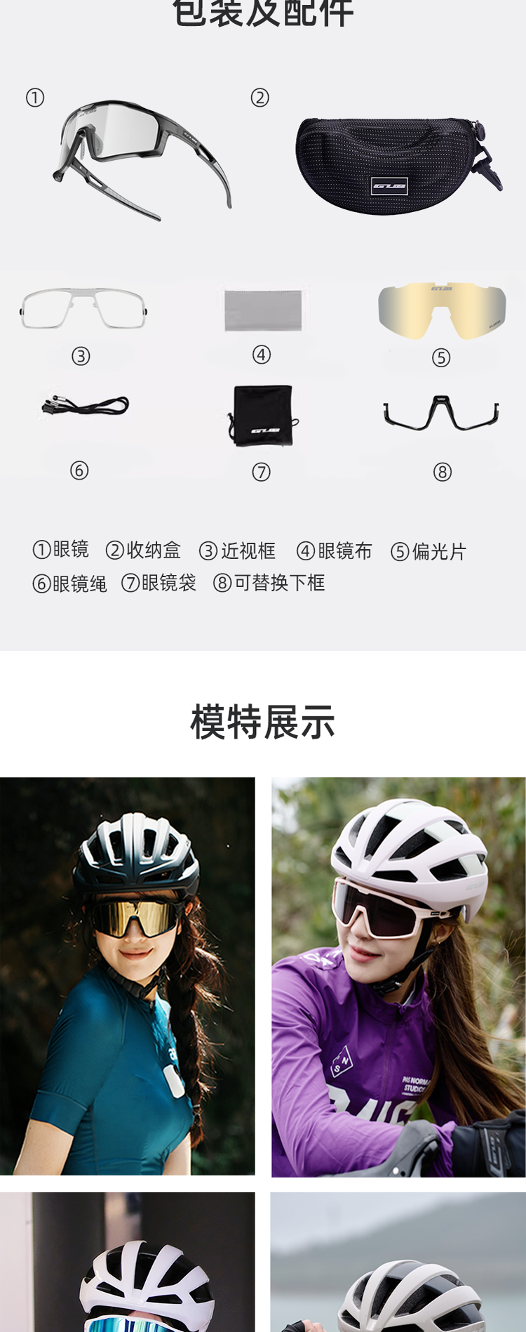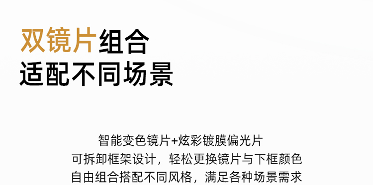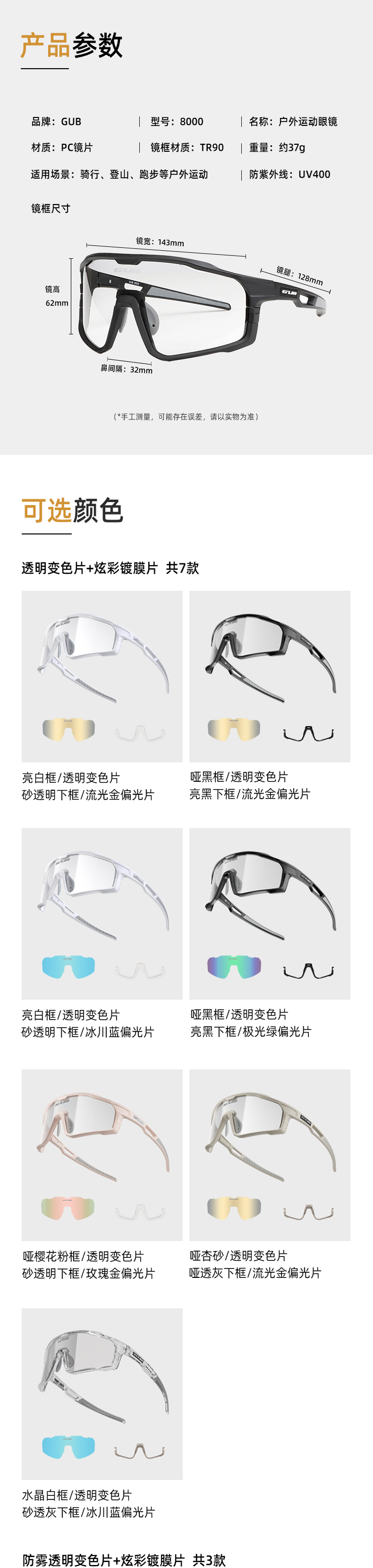 顏色:亮白/透明變色片(冰川藍偏光片)、亮白/透明變色片(流光金偏光片)、啞黑/透明變色片(極光綠偏光片)、啞黑/透明變色片(流光金偏光片)、水晶紫/透明變色片(魅力紫偏光片)、水晶灰/透明變色片(星空銀偏光片)、水晶白/透明變色片(冰川藍偏光片)、啞櫻花粉/透明變色片(玫瑰金偏光片)、啞杏砂/透明變色片(流光金偏光片)