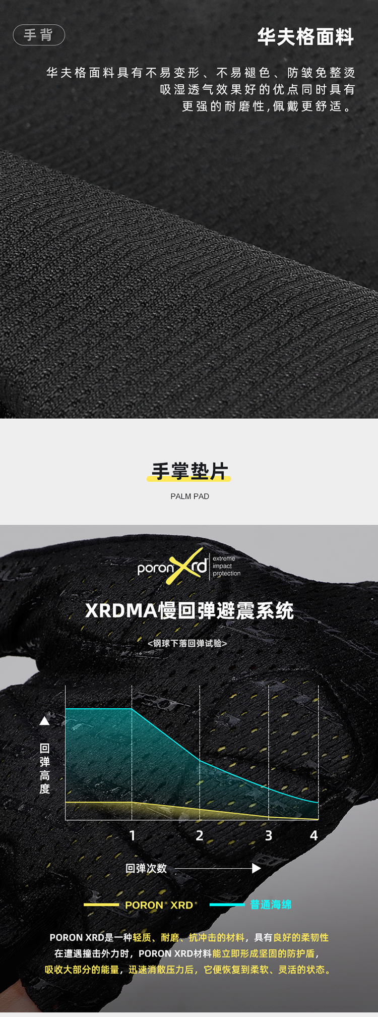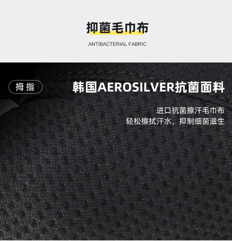 材質(zhì):華夫格高彈透氣面料、進(jìn)口PORON XRD 緩沖掌墊、掌心采用仿生科技網(wǎng)眼、韓國Aerosilver抗菌面料(擦汗布)