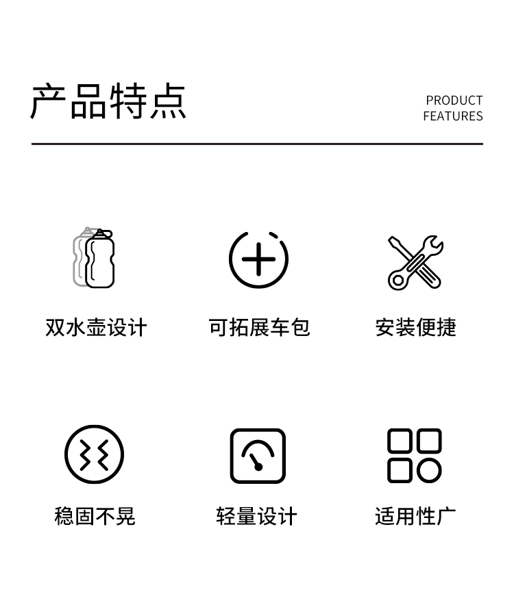 特點(diǎn):單/雙水壺架兩種模式,輕量化設(shè)計,可拓展車尾包,安裝便捷