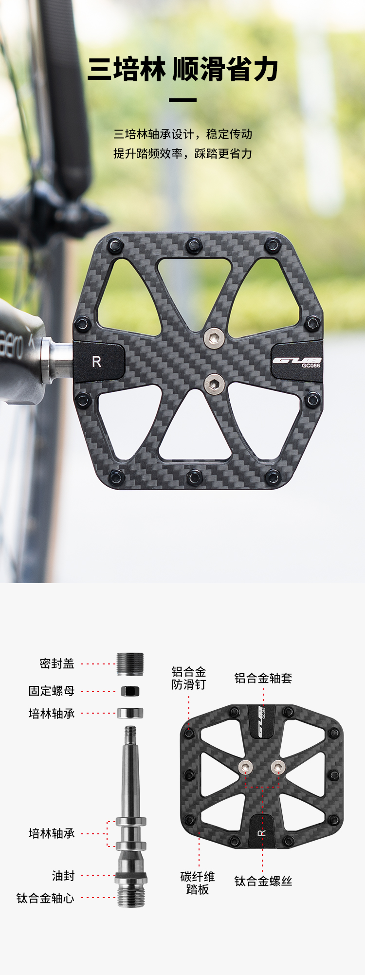 材質(zhì):碳纖維踏板+鋁合金軸套+鈦合金軸芯
