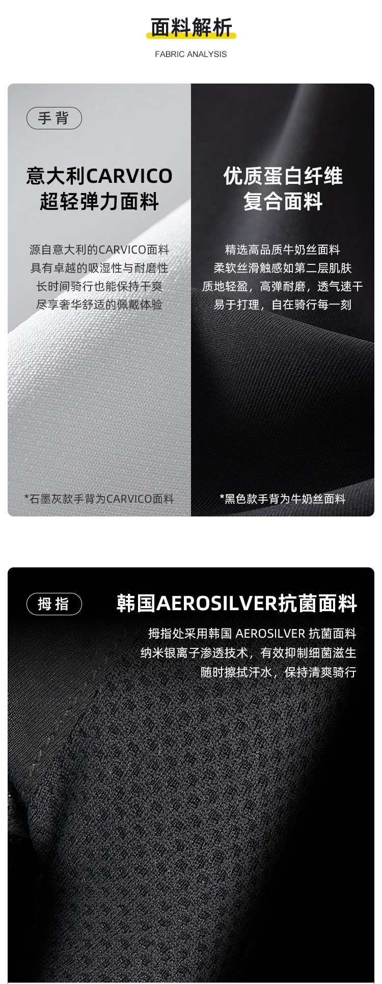材質(zhì):意大利Carvico(石墨灰)、牛奶絲手背面料(黑色)、3D打印TPU掌墊、進(jìn)口PORON XRD緩沖掌墊、韓國(guó)大孔PU掌面、韓國(guó)Aerosilver抗菌面料(擦汗布)