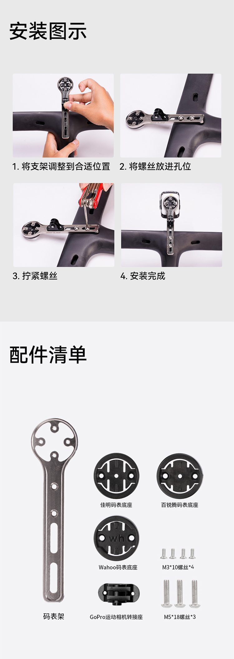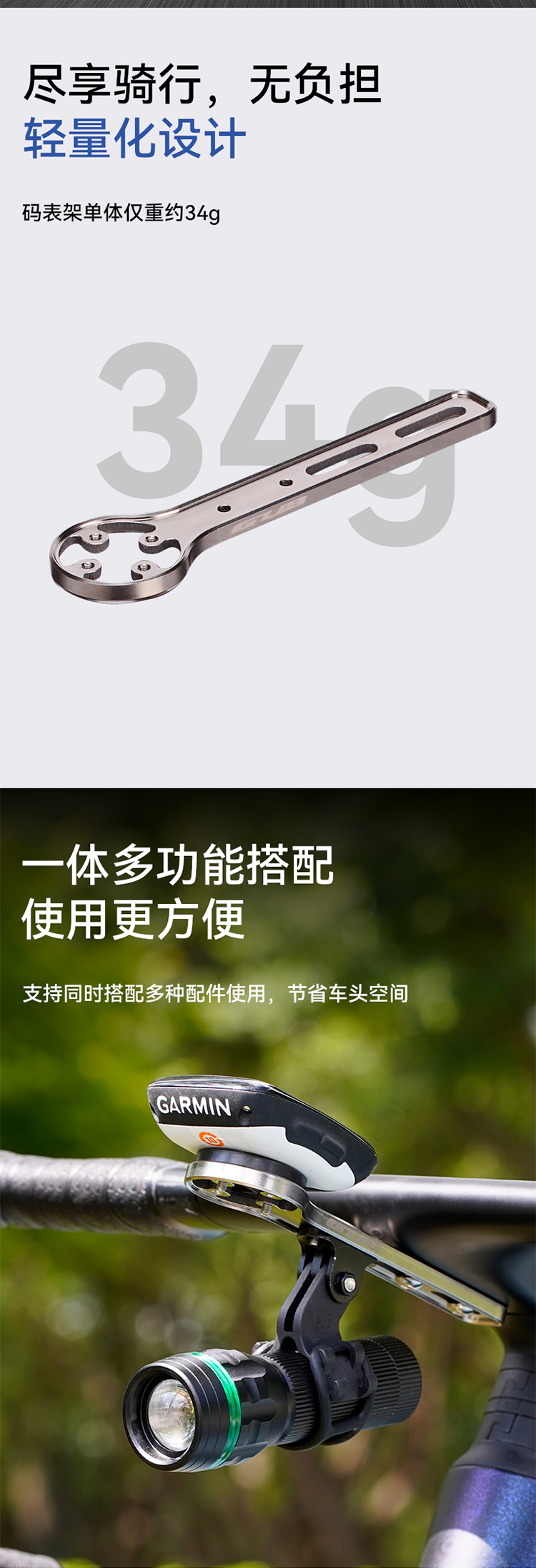特點:鈦合金超輕架體,居中安裝節(jié)省空間(一體把專用),兼容多種碼表,標(biāo)配運動相機轉(zhuǎn)接座,可擴展使用運動相機等配件