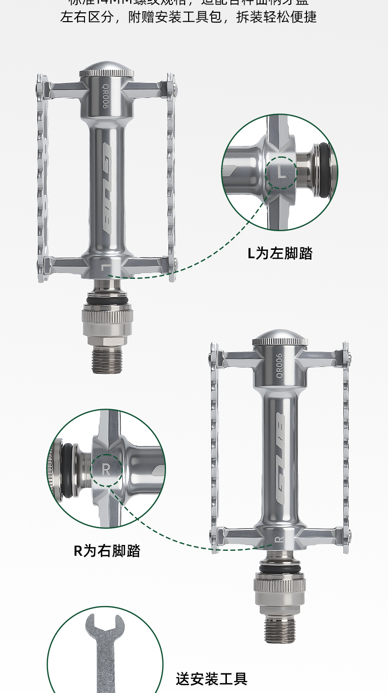 重量:雙快拆凈重約380克/對,毛重約456克 ;左快拆右螺紋腳踏凈重約340克/對,毛重約438克